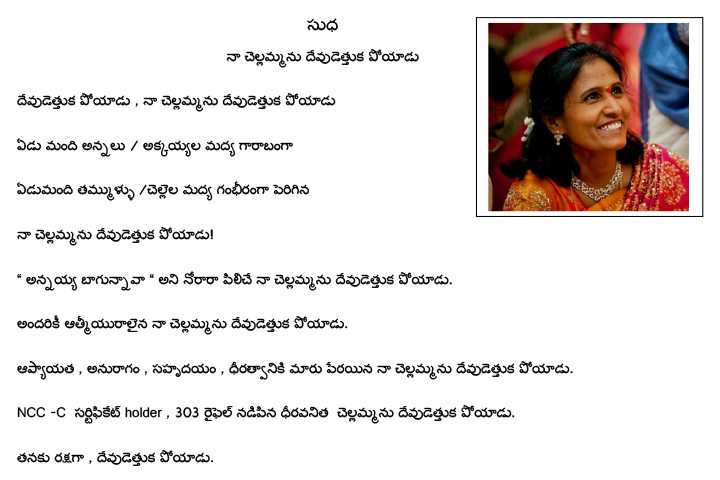 Sudha was married to Venkat Pattabathula on 1 May 1985 in Hanmakonda and followed Venkat to an unknown place Surat in Gujarat state where she made lot of friends. Sudha gave birth to her first child, Srujana in 1986 and then moved to Saudi Arabia with her daughter to accompany Venkat for his new job. Sudha has again made lot of friends there.